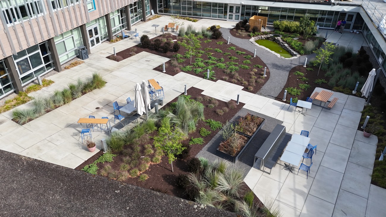 - New entry plaza with plant bed showcasing native vegetation surrounded by permeable pavers and benches made of recycled materials.